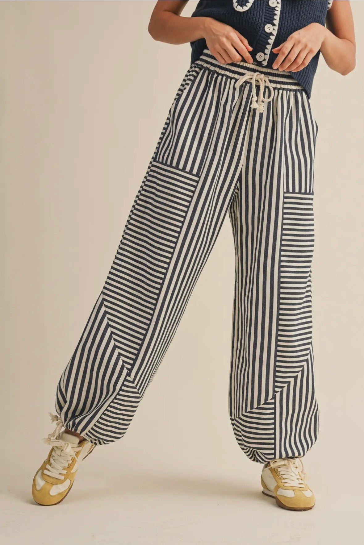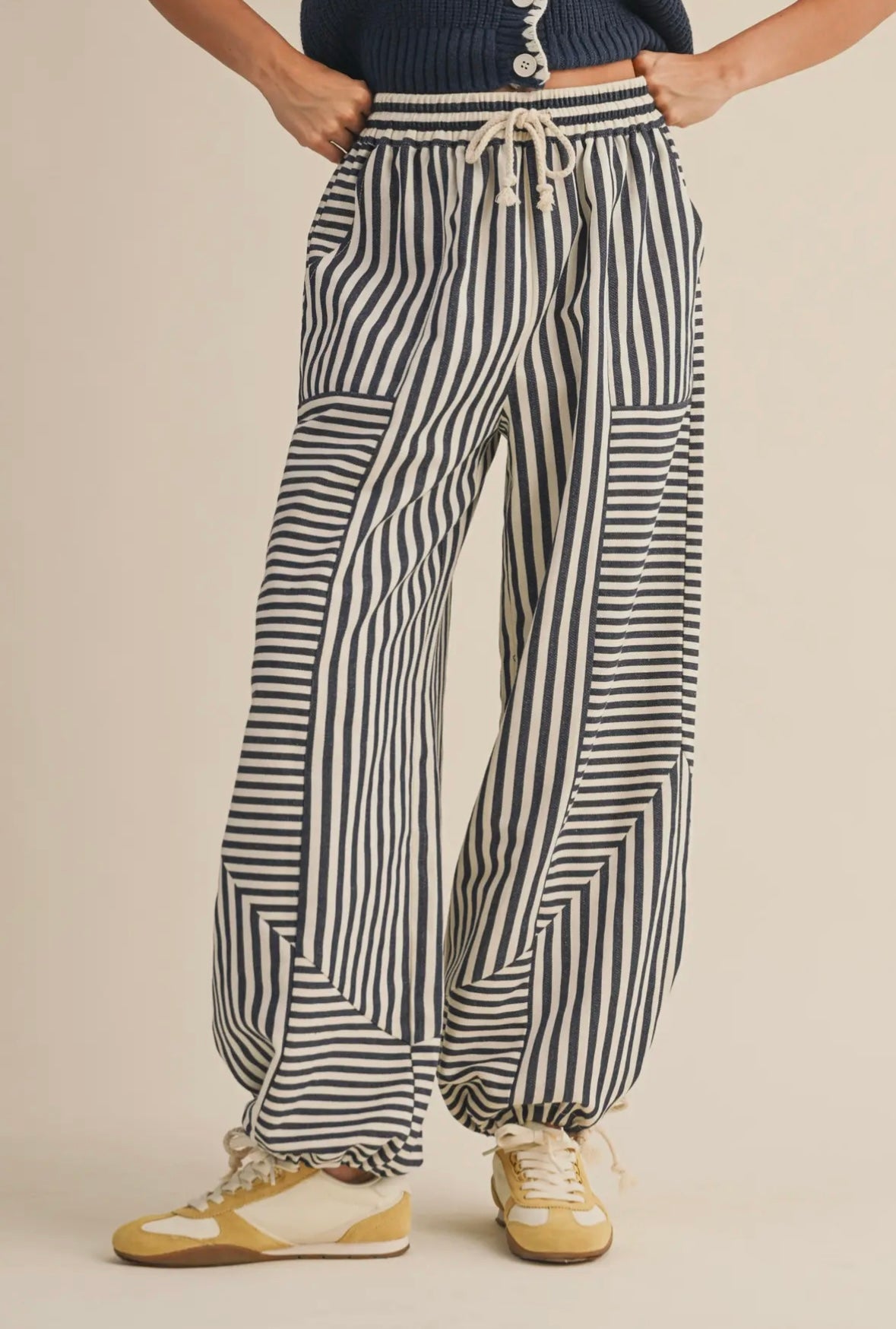 The Mia Striped Parachute Pants - Navy / Small is backordered and will ship as soon as it is back in stock.