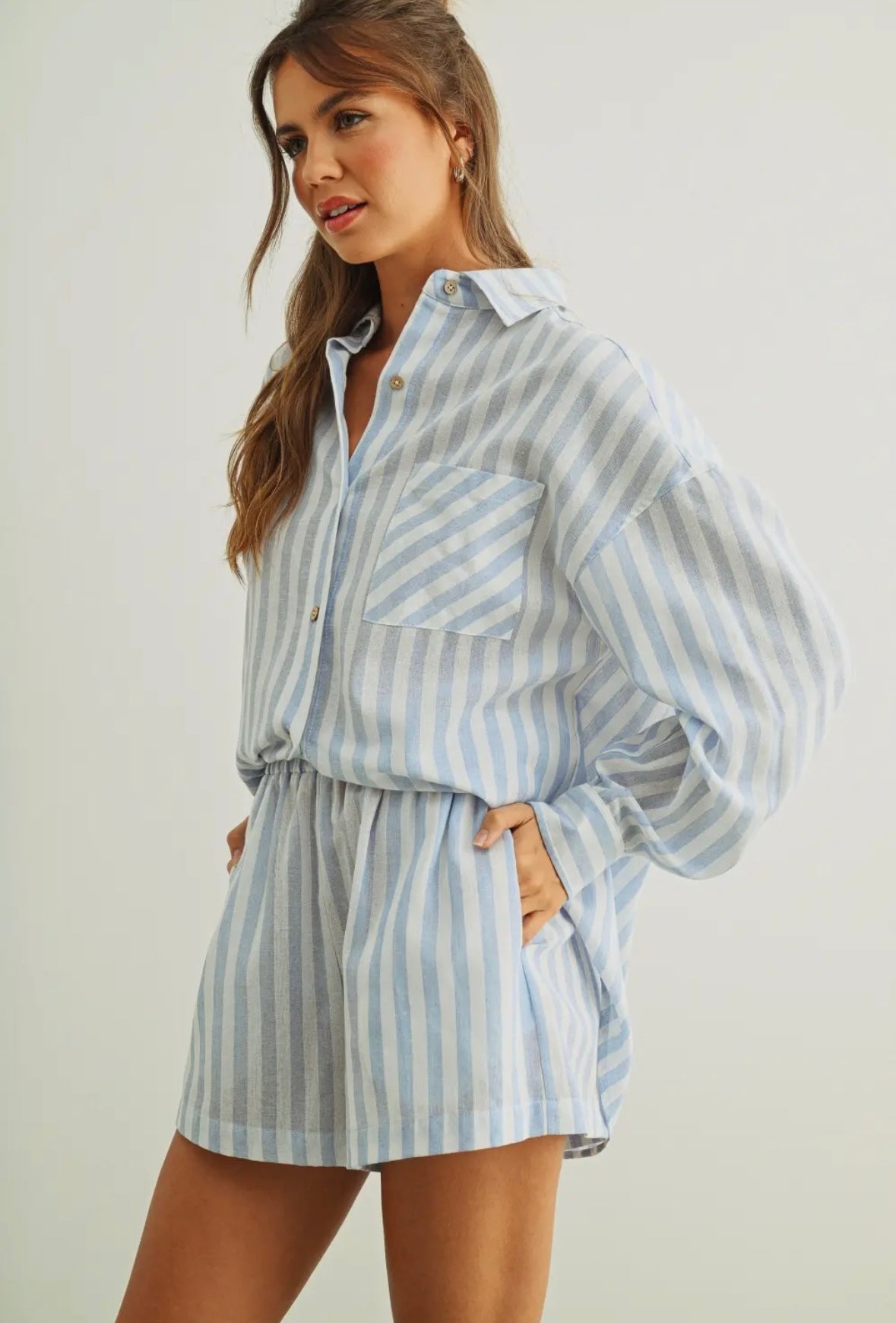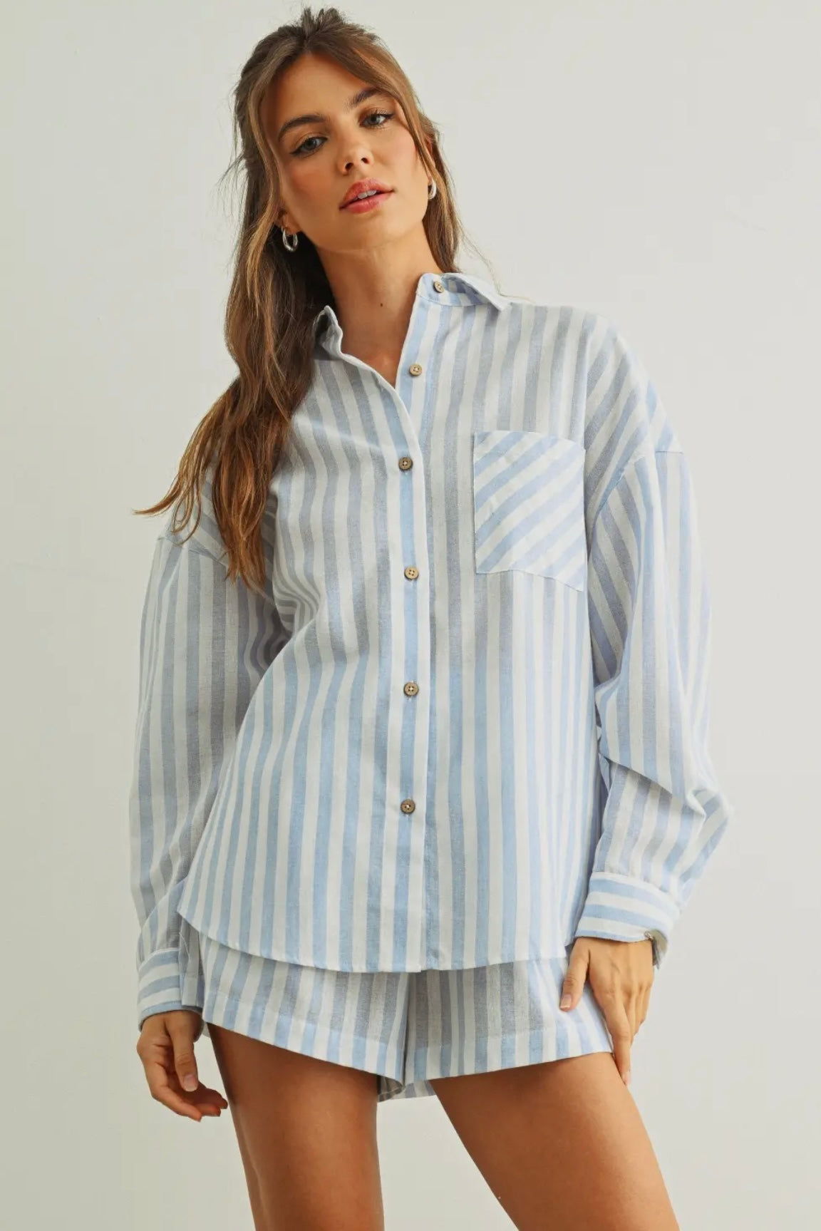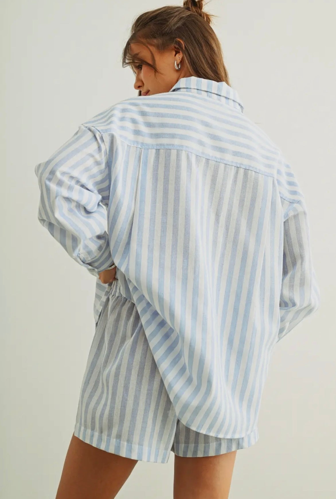 Relaxed, timeless, and effortlessly chic, this oversized striped button-down brings a “borrowed-from-the-boys” vibe to your wardrobe. Classic vertical stripes, a crisp collar, and a button-front design add a polished touch to its easy, loose fit—perfect for layering with The Aria Striped Shorts or wearing on its own.